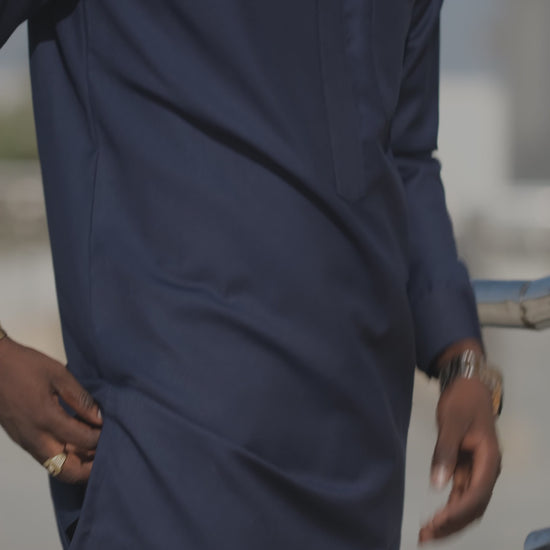 La tenue IGO incarne l’équilibre parfait entre modernité, pureté et détails artisanaux soigneusement pensés. Confectionnée dans un tissu Super 100 bleu nuit, elle offre une fluidité exceptionnelle, un confort supérieur et une tenue impeccable tout au long de la journée.