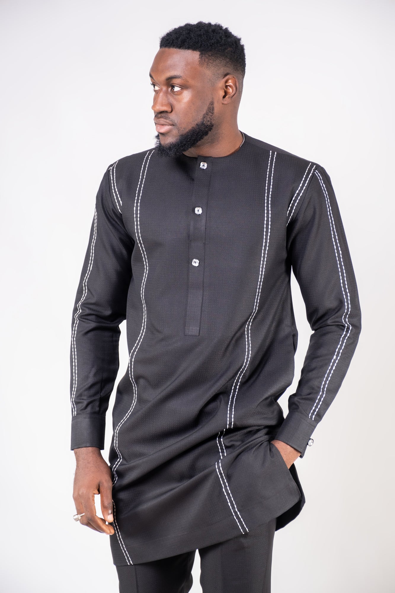 La tenue Bandiougou est un ensemble à la fois sobre, moderne et extrêmement raffiné. Conçue dans un tissu noir profond, elle se distingue par ses lignes blanches contrastées soigneusement brodées qui allongent et structurent la silhouette.