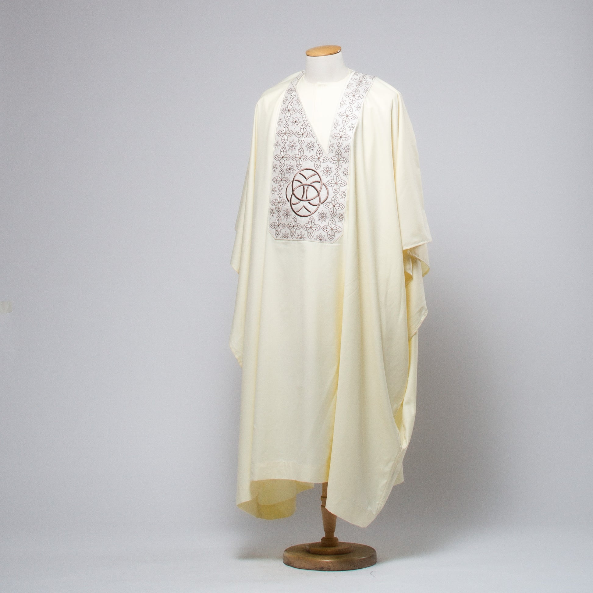 Son boubou ample, au tombé fluide et enveloppant, évoque les silhouettes royales d’Afrique de l’Ouest. Le plastron brodé, richement orné de motifs symétriques, met en valeur la poitrine et ajoute une touche d’élégance traditionnelle. Au centre, un grand motif circulaire attire l’œil avec puissance, symbole d’autorité, d’harmonie et de prestige.